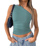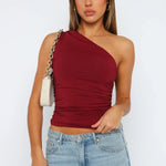 Turn heads with this stunning one-shoulder ruched crop top in a rich burgundy hue. Designed to accentuate your silhouette, the gathered side detailing adds texture and elegance to this bold, minimalist piece. The asymmetric neckline brings a modern, edgy touch while still feeling timeless and flattering.