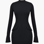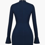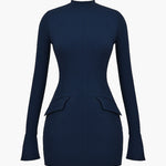 Step into timeless elegance with this navy bodycon mini dress. Designed to flatter the silhouette, it features a high neckline, long fitted sleeves with subtle flared cuffs, and sharp peplum-style flap details at the waist that enhance your curves. The clean, structured look offers effortless sophistication for any upscale event.
