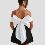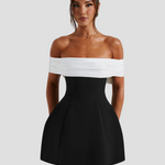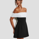 This elegant off-shoulder mini dress is designed to accentuate your waist and shoulders with its structured bodice and flared skirt. The draped fold-over neckline adds a refined touch, while the tailored fit enhances your natural curves. Perfect for cocktail evenings, weddings, or upscale dinners.