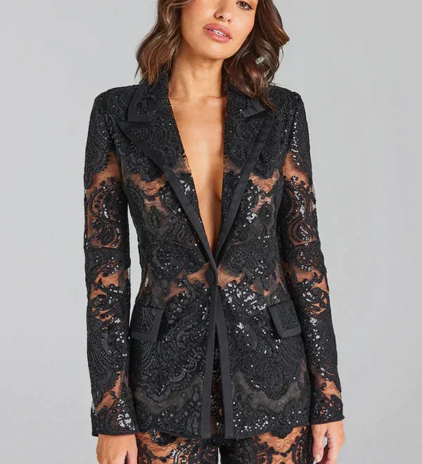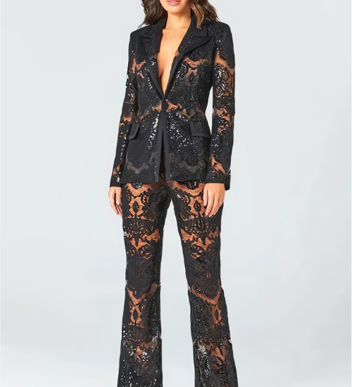 Lace Co-Ord Set with Sheer Blazer and Flared Trousers