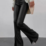 Make a bold fashion statement with these sleek high-waisted faux leather trousers. Crafted from soft and stretchy vegan leather, these trousers feature a flared leg design with front slits for a modern twist.